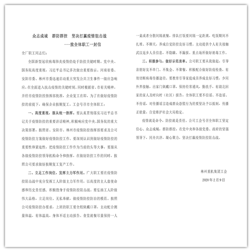 會議根據(jù)林州市委、市政府部署,及時(shí)推遲公司復(fù)工時(shí)間,并成立林州重機(jī)疫情防控工作領(lǐng)導(dǎo)小組及四個(gè)保障小組,全 面動(dòng)員和落實(shí)疫情防控工作。